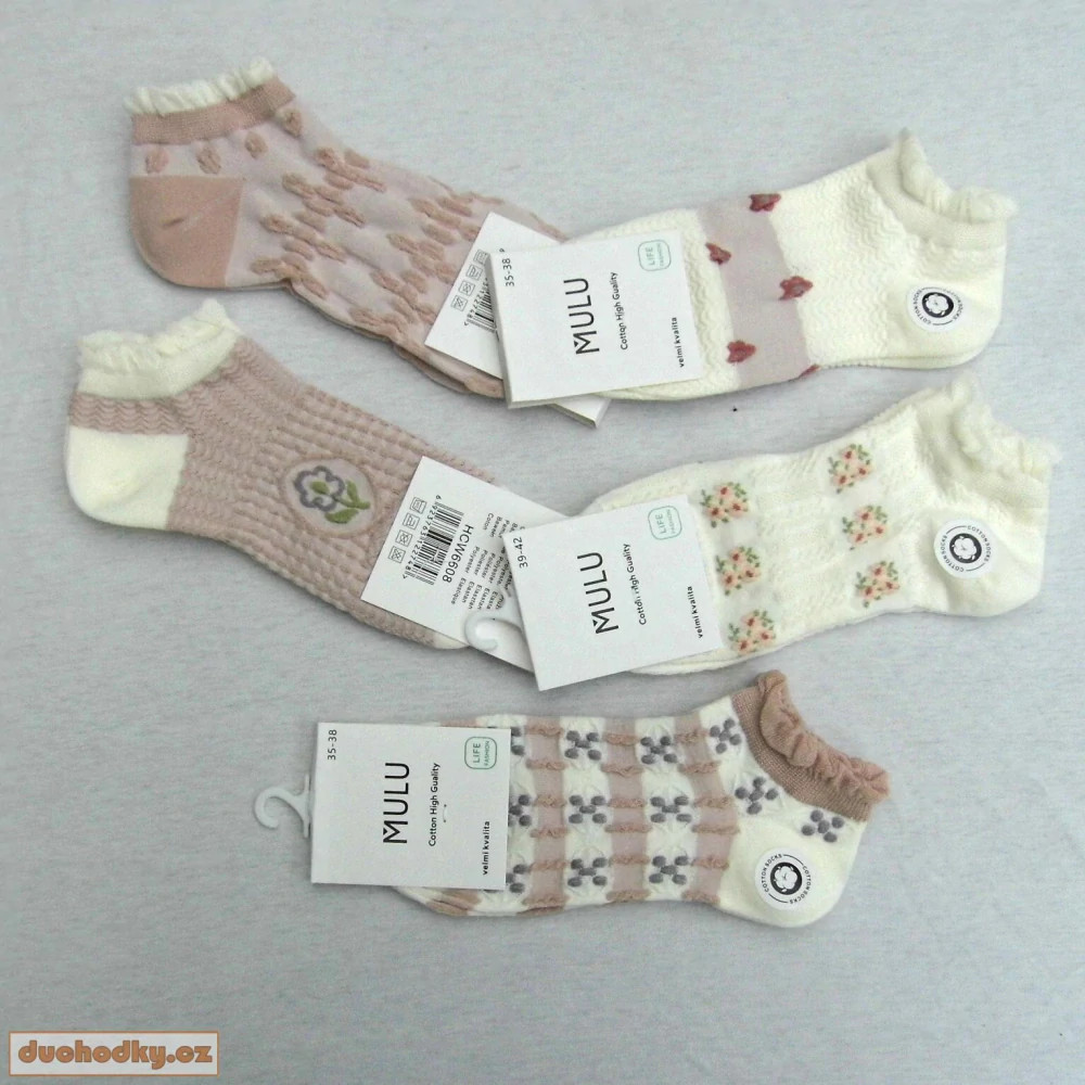 Dámské snížené bavlněné ponožky s veselým motivem květů . Lem zdobený kanýrkem, různé vzory, některé v 3D provedení.