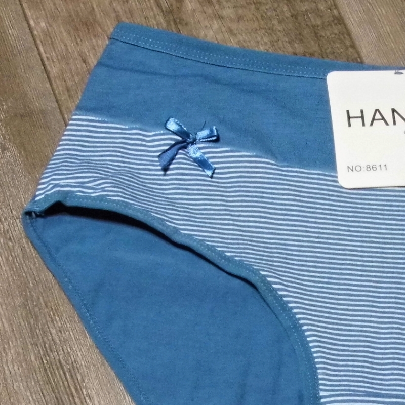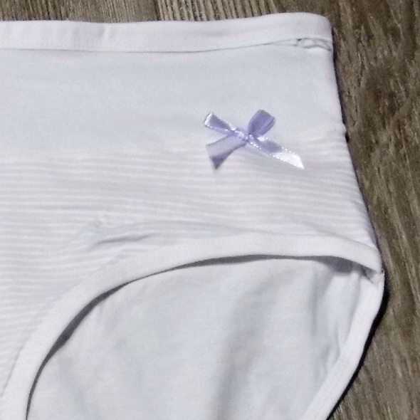 Přední část kalhotek je zdobena jednobarevným pasem, dvěma mašličkami a pruhovanou látkou, zadní část je jednobarevná.