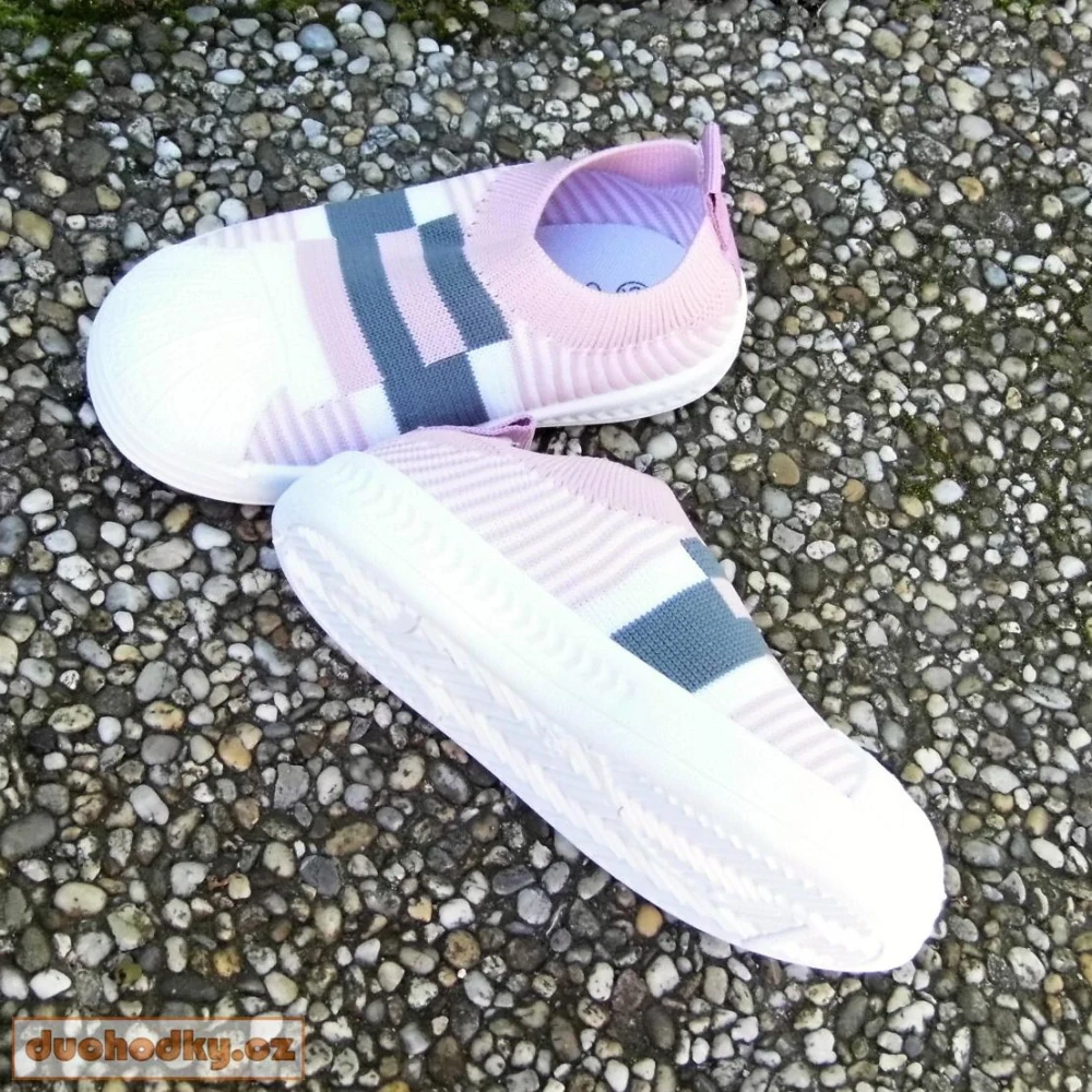 Dětská nazouvací obuv s pružným lemem a širokou špicí . polyesterové plátno s pružícím lemem umožňuje snadné nazouvání. Široká špice dává dostatečné pohodlí pro prsty nohou a bílá gumová podrážka je vhodná na doma i na ven. Na výběr tři barevné varianty : růžovo bílá, bílo černá a vínovo modrá ve velikosti EUR 24- 26.