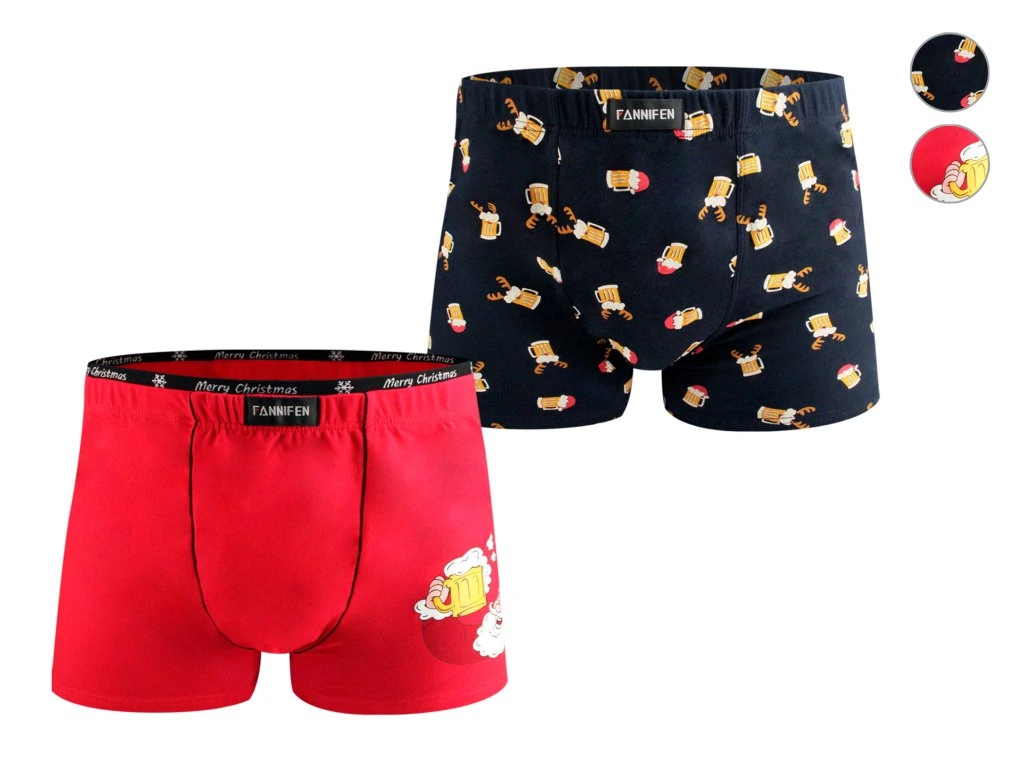 Vánoční pánské bavlněné trenkoslipy - boxerky v dárkové krabičce moderního střihu zaručují pohodlné nošení mužům všech generací. Balení obsahuje 2 kusy ve stejné velikosti : jedny červené s větším obrázkem hlavy Santy s pivem a jedny modré s drobnými vánočními motivy půllitru s pivem.